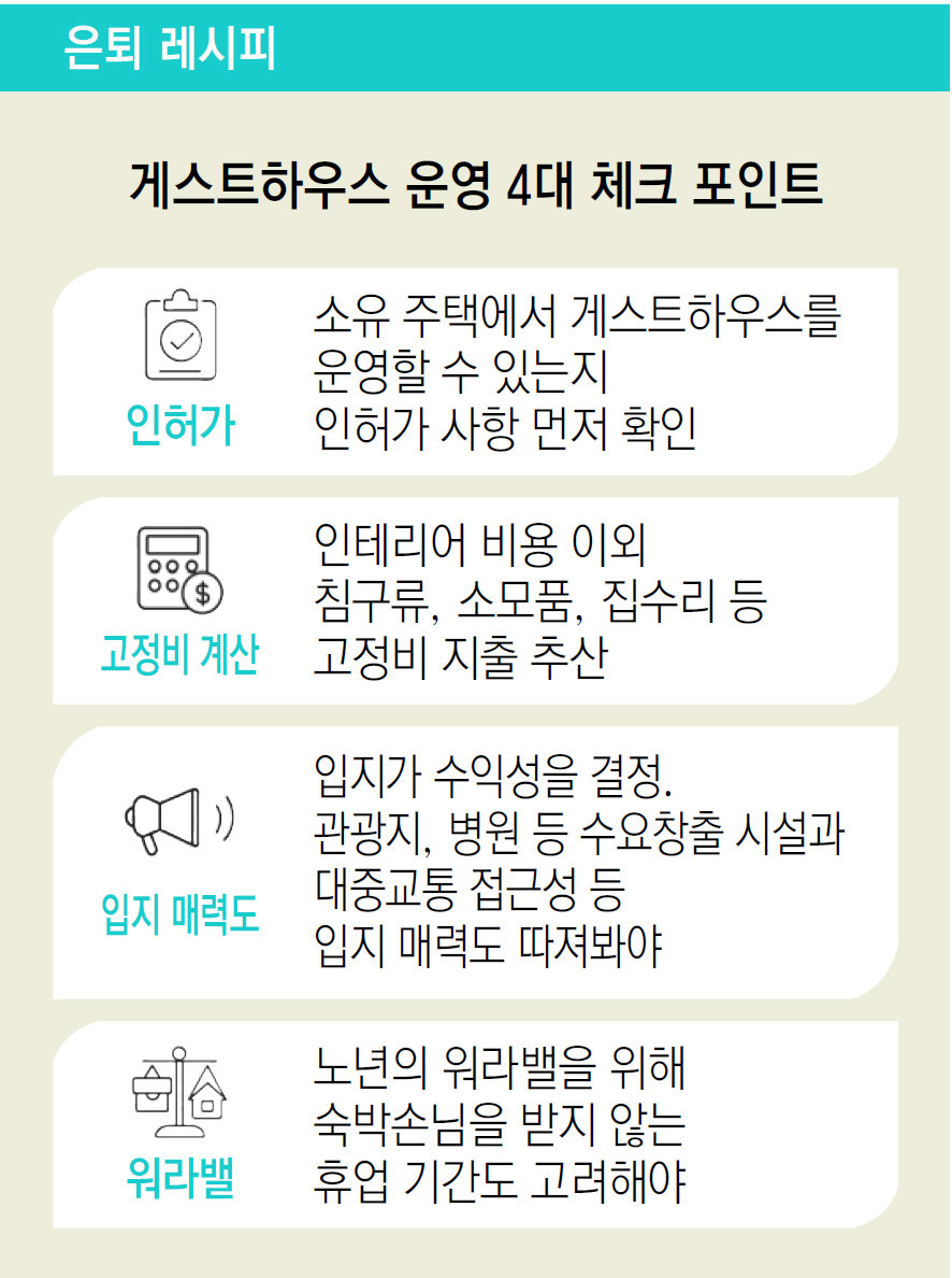 그래도 50년 된 집이라 손볼 곳은 계속 생겨났다. 지난해에는 반지하 현관 도어락을 터치식으로 교체하는 데 100여 만 원, 2층 누수 보수에 120여 만 원이 들었다. 이런 식으로 연간 유지관리비가 300만∼400만 원, 월 30만 원꼴로 나간다. 여기에 전기·가스·케이블·인터넷 등 관리비가 월 100만 원, 휴지·생수 등 소모품과 2층 손님 아침 식사 준비에 월 20만 원이 든다. 대출을 갚던 시기에는 세금까지 합쳐 매월 350만∼400만 원이 고정비로 나갔다. 대출 상환이 끝나고 월 매출도 안정 궤도에 오르면서 수익의 상당 부분을 저축하기 시작한 게 그리 오래 전 일이 아니다.