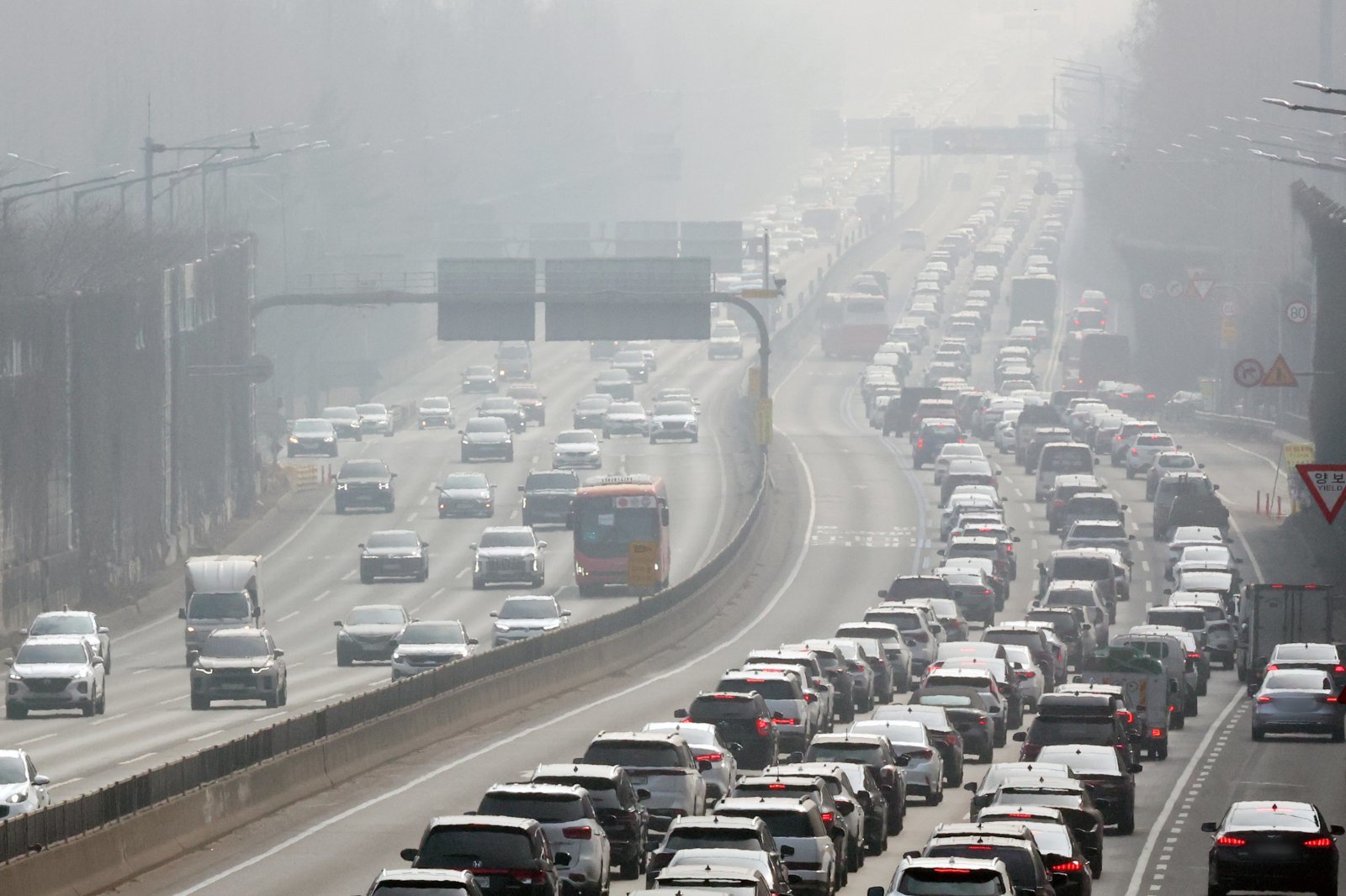 설 연휴가 시작된 14일 오후 서울 서초구 잠원IC 인근 경부고속도로 하행선(오른쪽)이 정체를 빚고 있다. 2026.02.14 뉴시스