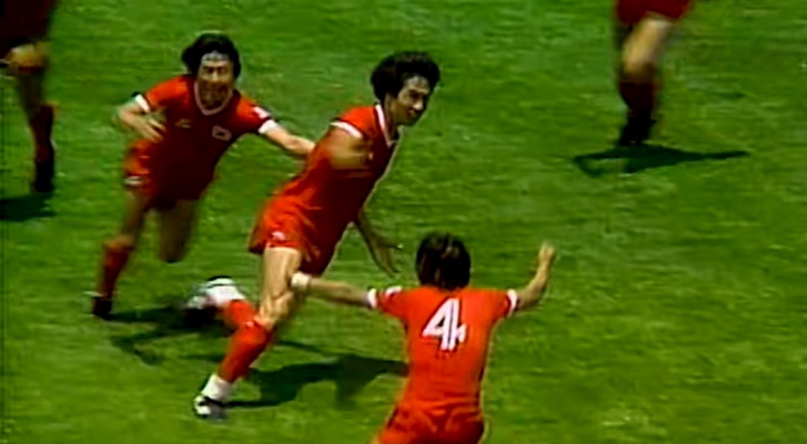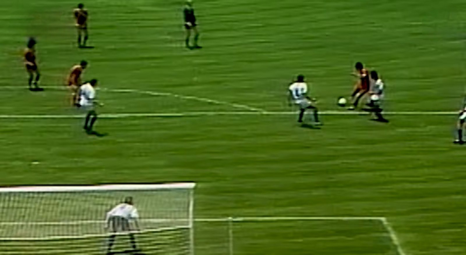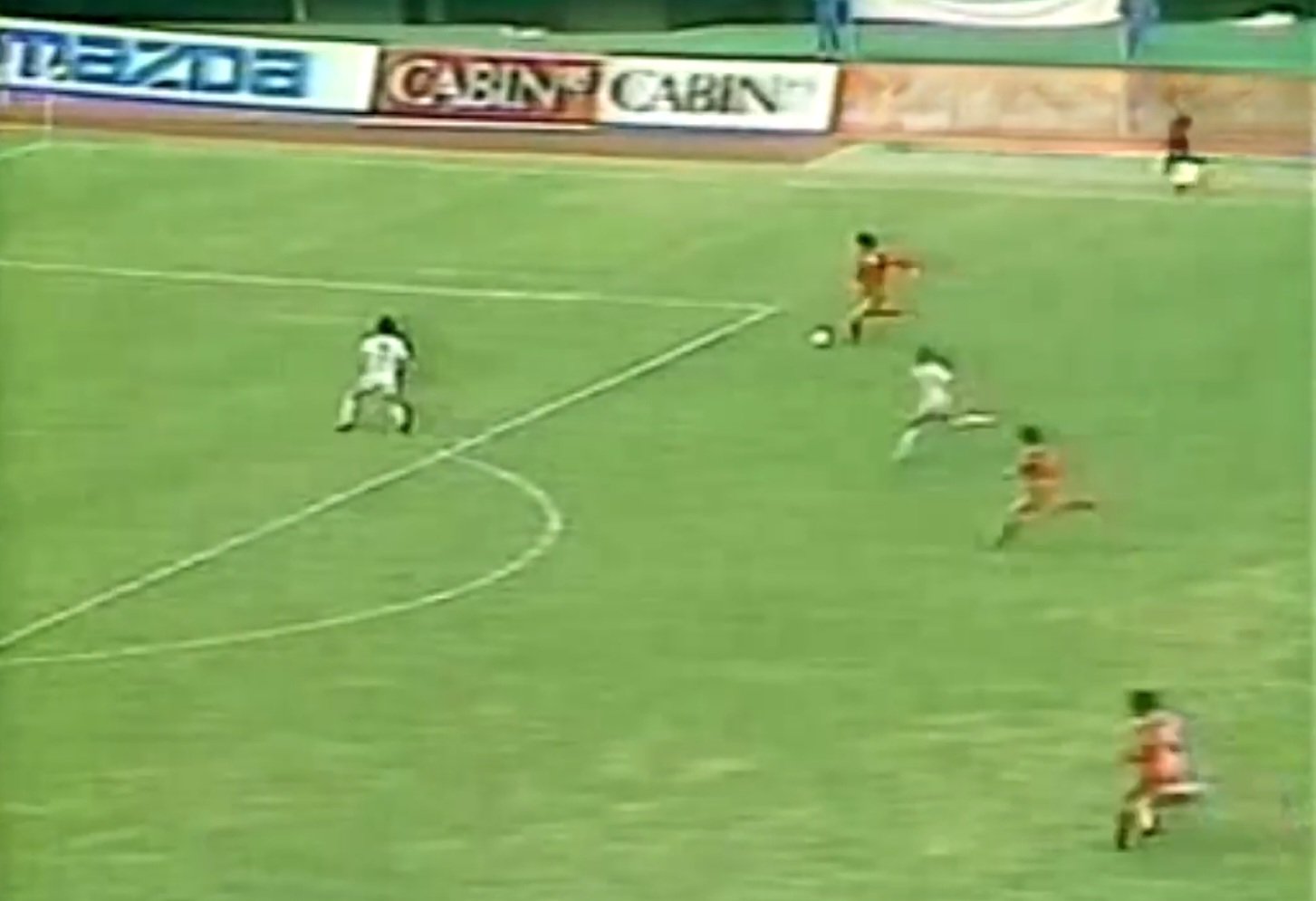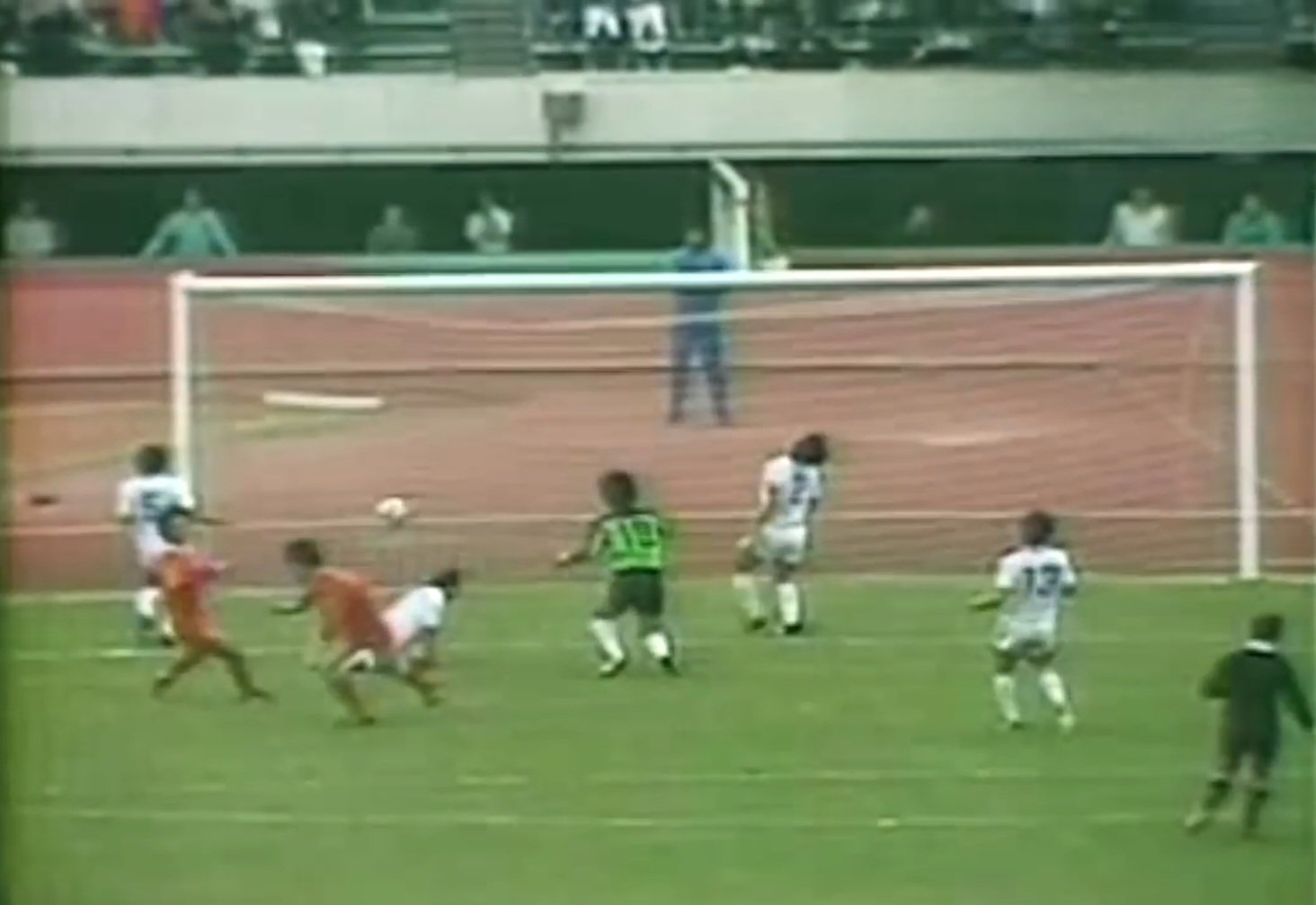 1986 멕시코 월드컵 예선 3차전 이탈리아와의 경기에서 역사에 남는 중거리포로 골을 터트린 최순호가 만세를 부르고 있다. MBC 유튜브 캡쳐.