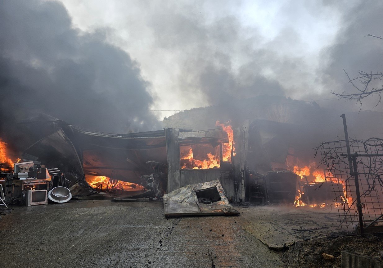 14일 오후 4시 1분쯤 경북 고령 덕곡면의 한 가구공장에서 원인을 알 수 없는 불이 나 소방 당국이 불길을 잡고 있다. 20262.15/경북소방본부 제공