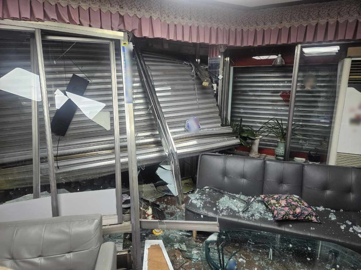 40대 남성 A 씨가 지난 14일 오후 4시 33분쯤 부산시 한 금은방에서 1.2톤 활어 운반차로 돌진해 침입한 뒤 귀금속을 훔치고 달아났다. 사진은 당시 A 씨가 금은방 출입문을 부수고 침입한 현장 모습(부산 수영경찰서 제공. 재판매 및 DB금지)