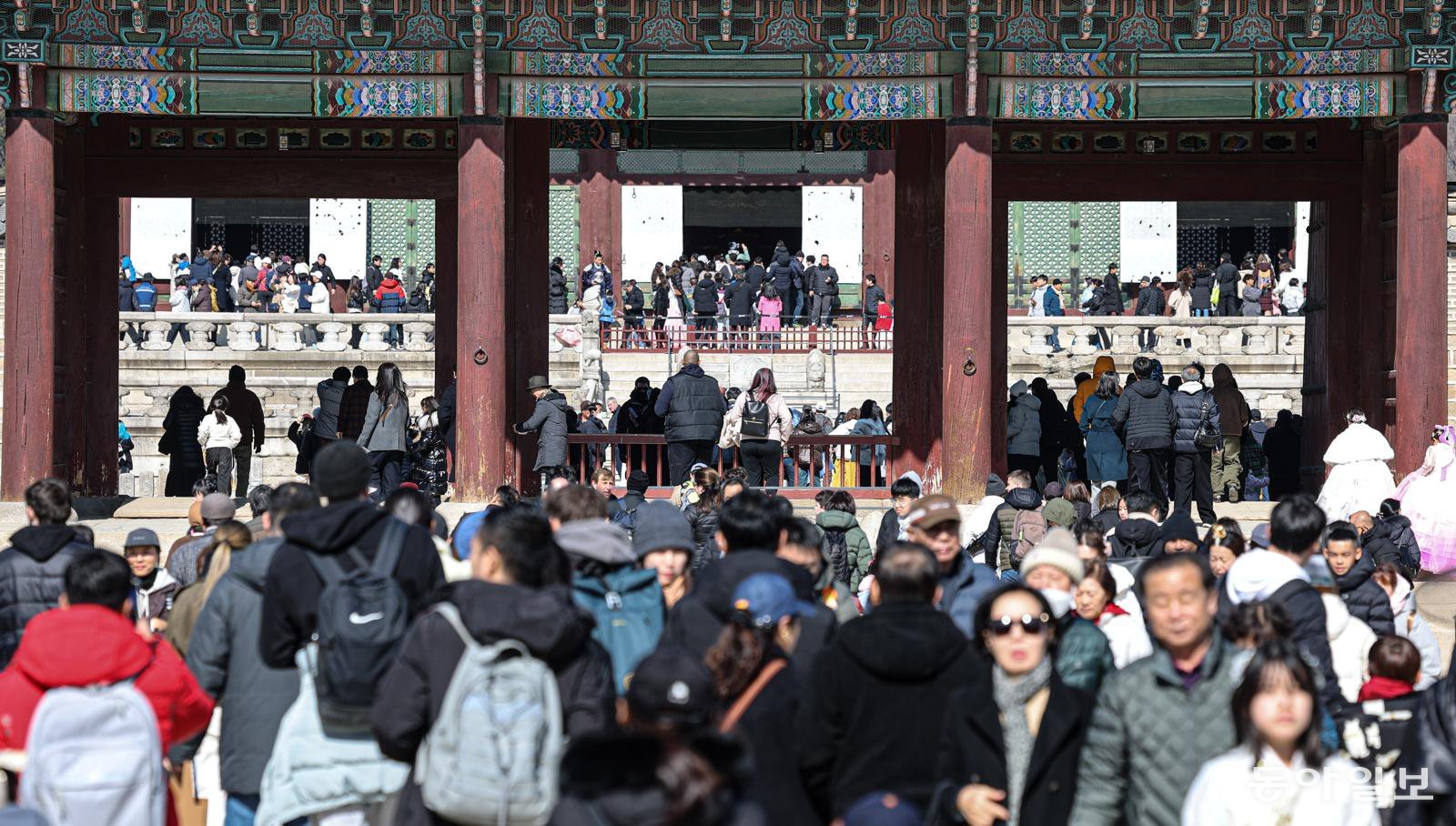 18일 오후 서울 종로구 경복궁이 나들이를 나온 방문객들로 북적이고 있다. 정부는 설 연휴 기간 경복궁을 비롯해 전국 22개 궁과 조선왕릉을 휴무 없이 무료로 개방했다.