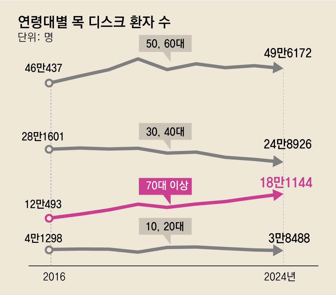 최근에는 고령 목 디스크 환자가 급증하는 추세다. 70대 이상 목 디스크 환자는 2016년 12만493명에서 2024년 18만1144명으로 50.3% 늘었고, 80대 이상은 같은 기간 2만3591명에서 2024년 4만8921명으로 2.1배로 급증했다. 반면 10·20대 환자는 6.8%, 30·40대는 11.6% 감소했다. 50대도 11% 감소했다.