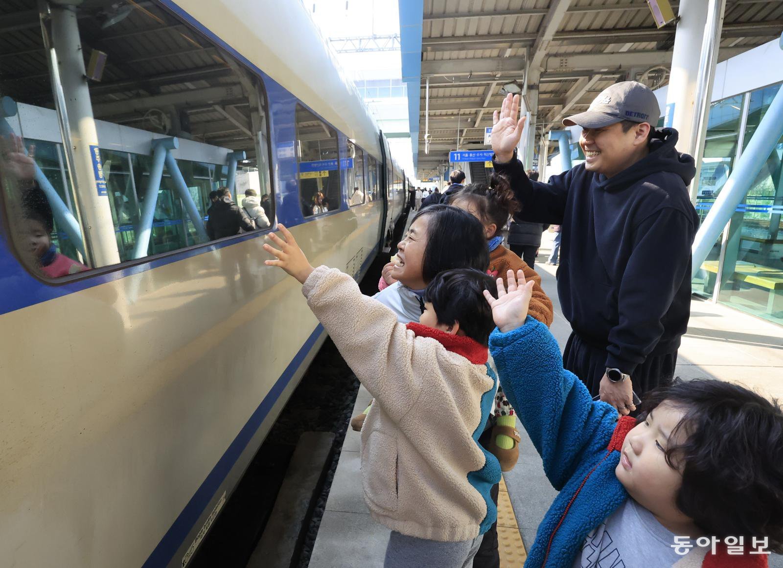 설 연휴 마지막 날인 18일 광주 광산구 광주송정역 서울행 KTX 열차 앞에서 가족들이 귀경객을 배웅하고 있다. 이날 전국 주요 도로와 철도는 귀경 차량과 승객으로 가득 찼다.