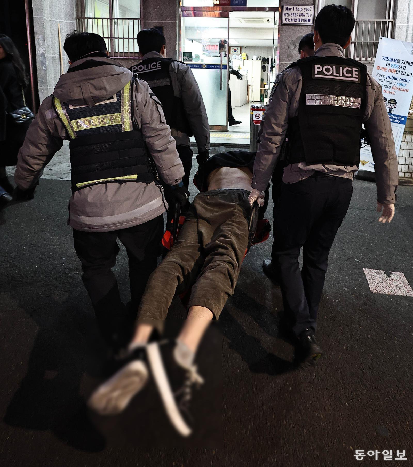 14일 새벽 서울 용산구 이태원파출소로 한 취객이 들것에 실려 들어오고 있다. 인사불성이 돼 몸을 가누지 못하는 이 취객을 파출소로 옮기기 위해 경찰관 4명이 투입됐다. 양회성 기자 yohan@donga.com