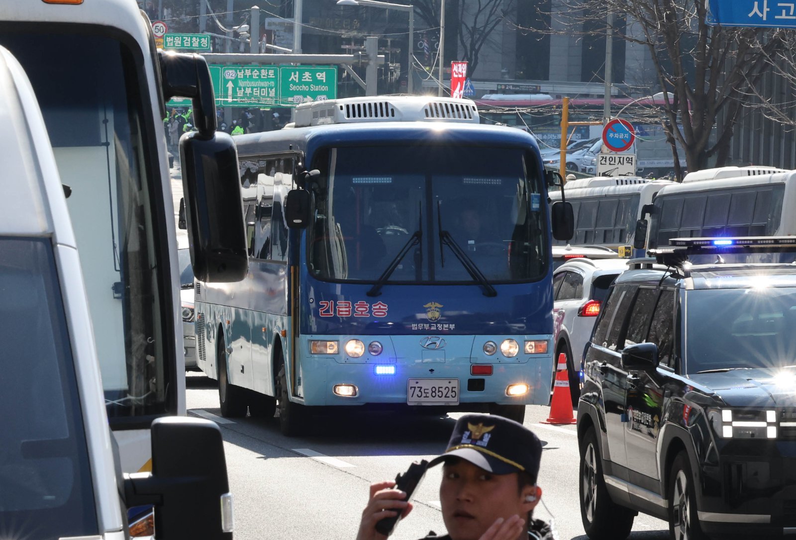 윤석열 전 대통령의 내란 우두머리 혐의에 대한 1심 선고일인 19일 오후 서울 서초구 중앙지방법원으로 윤 전 대통령을 태운 호송차가 들어가고 있다. 2026.02.19 뉴시스