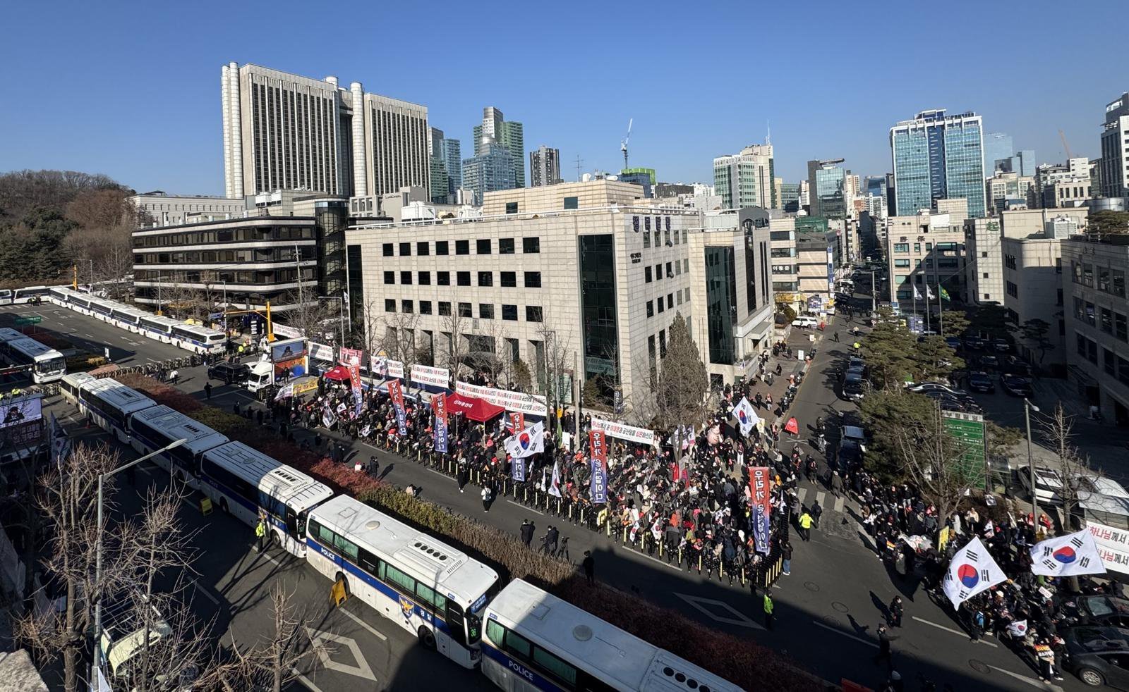윤석열 전 대통령의 12·3 비상계엄 관련 내란 우두머리 등 혐의 1심 선고 기일인 19일 서울 서초구 중앙지방법원 주위의 경찰차벽 앞에서 지지자들이 집회를 열고 있다. 2026.2.19 ⓒ 뉴스1
