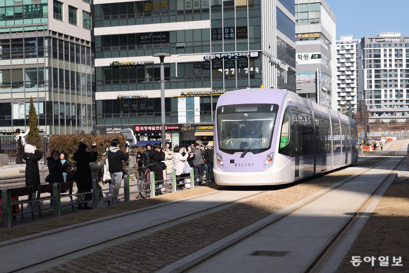 19일 서울 송파구 위례신도시에서 위례선 트램 차량 시운전이 시작됐다. 주민들이 사진을 찍고있다. 김재명 기자 base@donga.com이날 시운전은 마천역을 시작으로 북위례역, 위례솔역, 덕수고등학교역, 위례호수공원역, 위례별역까지 진행됐다.