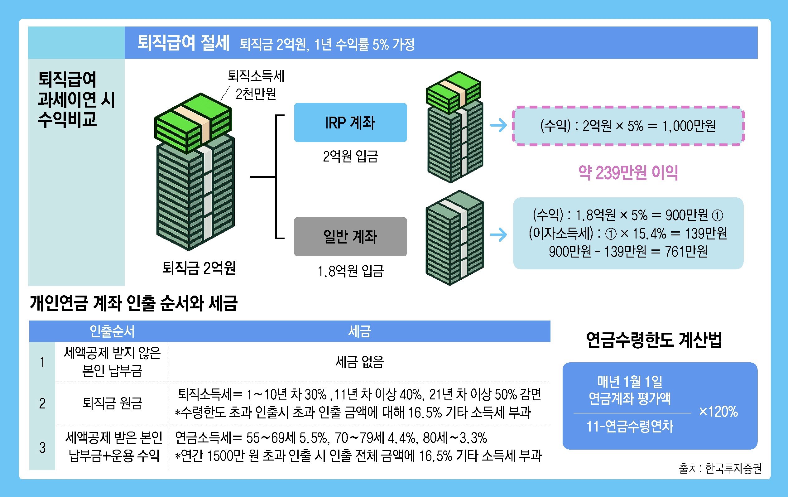 퇴직금을 받는 IRP 계좌는 기존 IRP 계좌와는 따로 개설하는 것이 인출할 때 더 편하다. 기존 IRP 계좌에 넣으면 수령 한도와 세율이 다른 자금들이 섞일 수 있다. 퇴직금 용으로 따로 만들면 퇴직소득세만 신경 쓰면 된다. 또 퇴직금을 새 IRP로 받았다 해도 필요하면 기존 IRP와 통합할 수 있다.