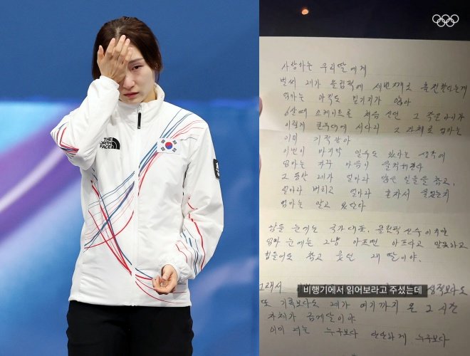 “사랑하는 우리 딸에게”라는 문구로 시작한 편지에는 “벌써 네가 올림픽에 세 번째로 출전한다는 게 엄마는 아직도 믿기지가 않아. 6살 때 스케이트를 처음 신던 그 작은 아이가 이렇게 큰 무대에 서다니 그 자체로 엄마는 이미 기적 같아”라는 내용이 최민정 어머니의 손글씨로 적혀 있다.