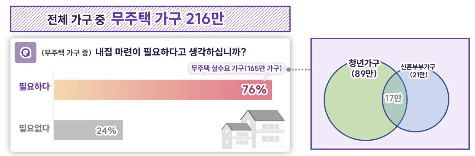 먼저 서울 시내 무주택 216만 가구 중 76%인 165만 가구는 ‘내 집 마련이 필요하다’고 느끼고 있었다. 이중 청년 실수요는 89만 가구, 신혼부부 실수요는 21만 가구인 것으로 집계됐다.