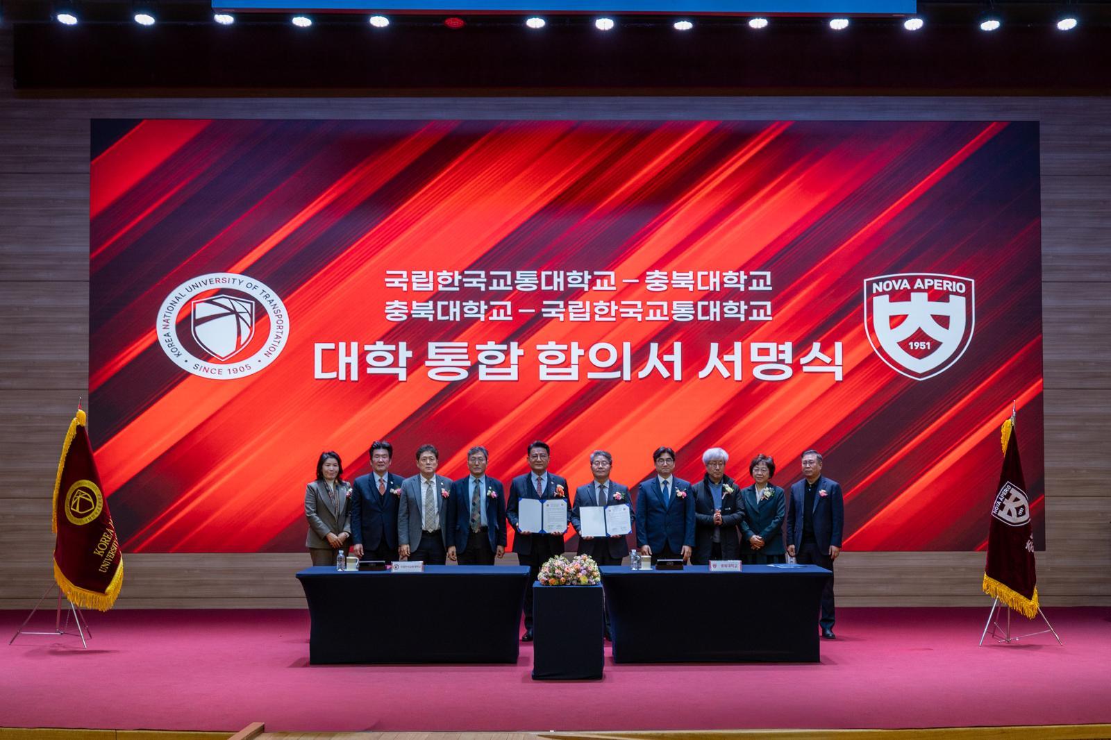 충북대(총장 직무대리 박유식)와 한국교통대(총장 윤승조)가 내년 3월 통합 대학으로 개교한다. 22일 양 대학에 따르면 윤 총장과 박 직무대리는 19일 오후 교통대 충주캠퍼스 대학본부 국제회의장에서 ‘대학 통합 합의서 서명식’을 연 뒤 통합 신청서를 교육부에 제출했다. 교육부가 국립대학 통폐합심사위원회를 열어 다음 달 중 통합을 승인하면 양 대학은 2023년 6월 ‘글로컬(글로벌+로컬)’ 대학 추진을 위해 손을 잡은 지 2년 9개월 만에 하나가 된다.