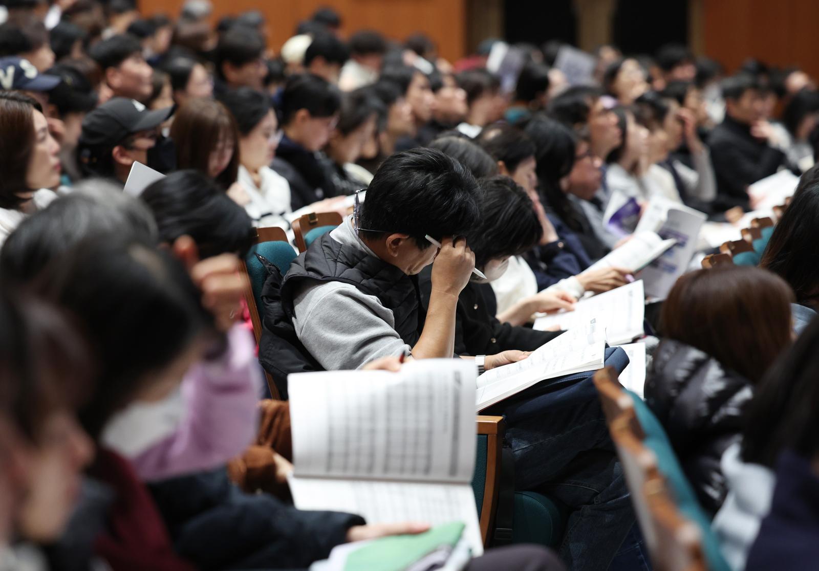 7일 서울 종로구 성균관대학교 600주년 기념관에서 열린 종로학원 주최 2026 정시 합격 가능선 예측 및 지원전략 설명회에서 참석자들이 자료를 살펴보고 있다. 2025.12.07. 뉴시스