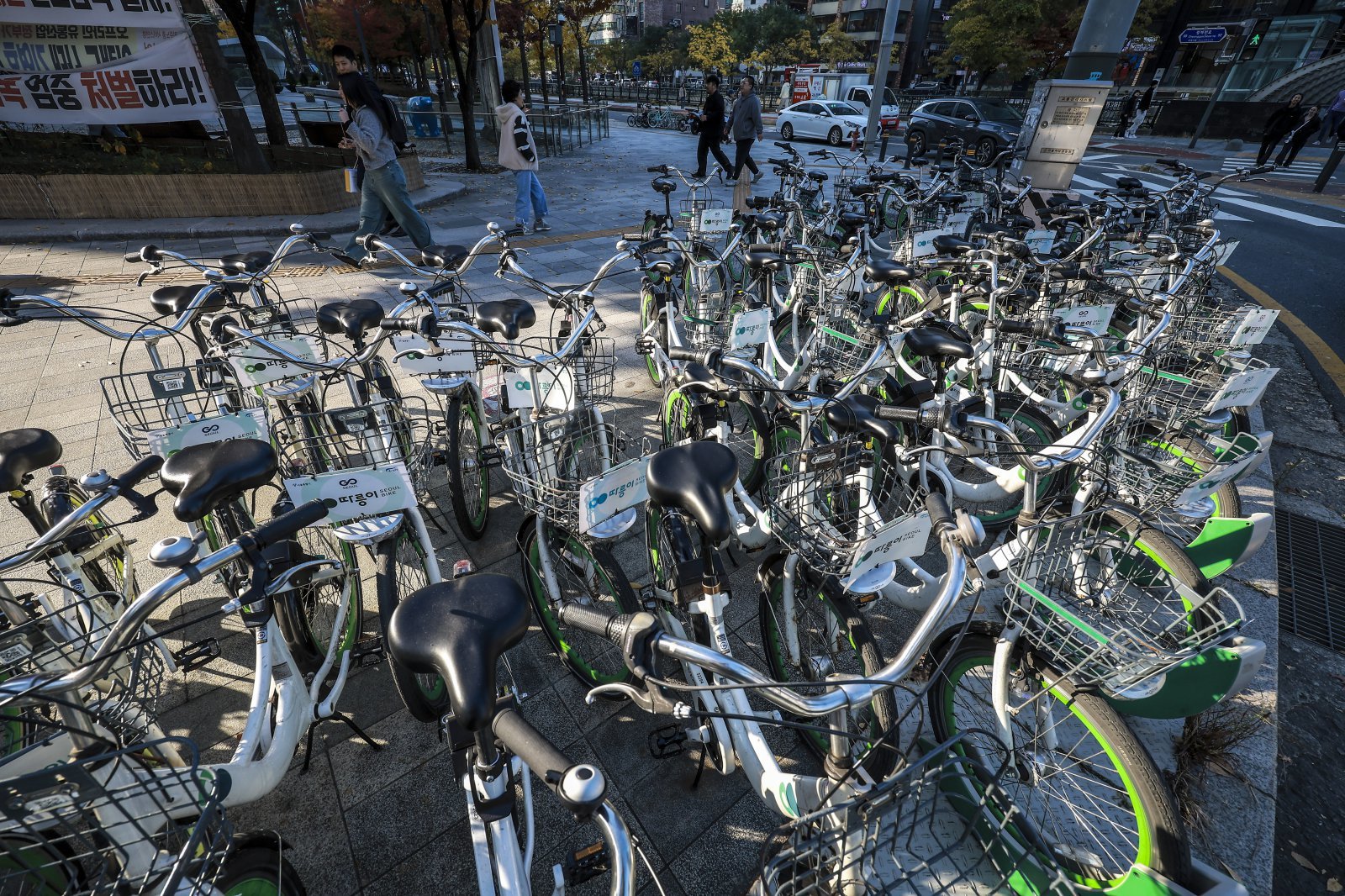 12일 서울시내 따릉이 대여소에 자전거가 세워져있다. 서울시 공공 자전거 따릉이를 타는 외국인 이용자가 급증했다. 이에 따라 시는 최장 이용 시간을 2시간에서 3시간으로 늘린다. 서울시에 따르면 K-컬처 열풍 등으로 서울을 찾는 외국인 관광객이 늘면서 따릉이 이용 외국인이 함께 증가하는 추세다. 지난 9월까지 외국인 따릉이 이용 건수는 2019년 동 기간 이용 실적 대비 2.5배 증가했다.2025.11.12. 서울=뉴시스