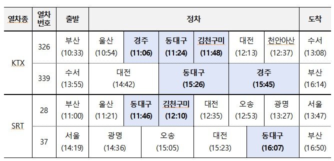 대구본부는 혼선 방지를 위해 김천구미역, 동대구역, 경주역 등 주요 역사에 안내문을 부착하고 출발 전 안내 방송을 강화할 계획이다.
