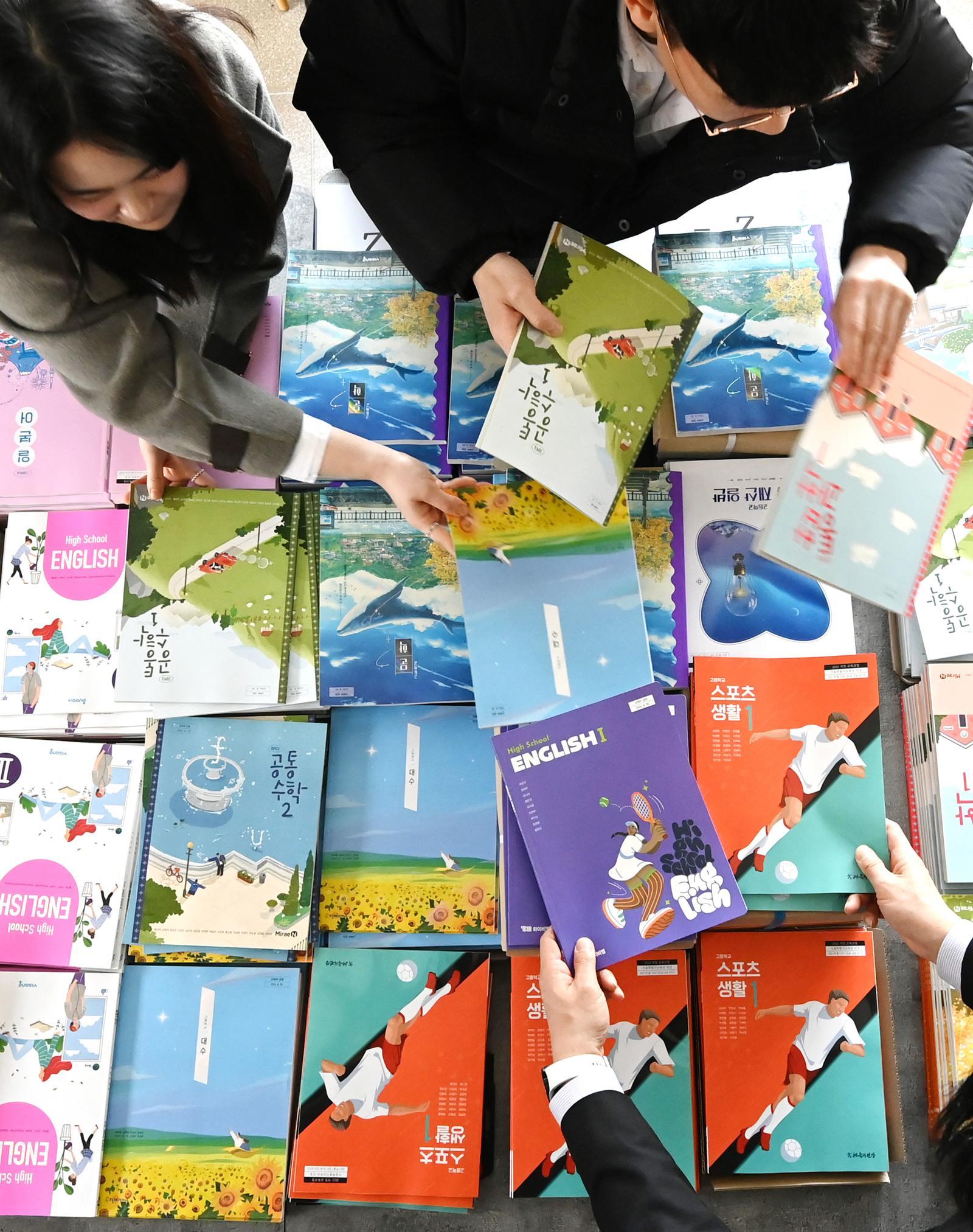 23일 경기 수원시 삼일공고에서 교직원들이 새 학기를 맞아 학생들에게 나눠줄 교과서를 분류하고 있다.