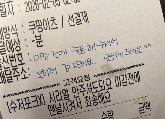 음식점 점주가 영업 종료 직전 배달 플랫폼으로 음식을 주문하며 미안해하는 고객에게 손글씨로 감사 인사를 전한 영수증 사진이 24일 온라인에서 확산했다.