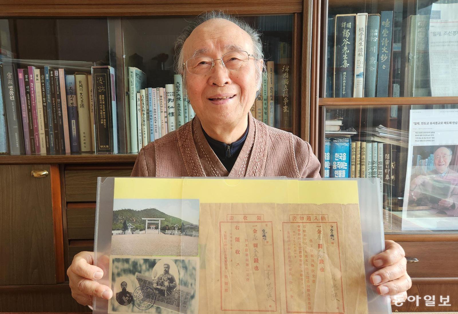 향토사학자인 심정섭 씨가 제107주년 3·1절을 맞아 일제가 면(面) 단위까지 신사 건립을 위한 강제모금을 자행했다는 증거 서류를 공개하고 있다. 이형주 기자 peneye09@donga.com