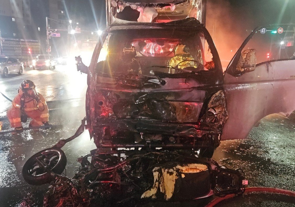 사고 직후 화물차와 오토바이에 불이 붙어 신고를 받고 출동한 소방 당국에 의해 10분 만에 꺼졌다.