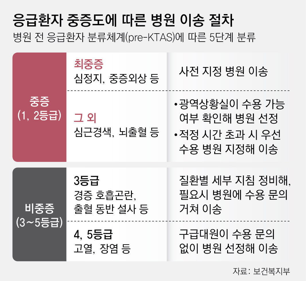 생사가 오가는 수준이 아닌 가벼운 호흡 곤란 등 중증도 3등급 이하 환자는 119구급대가 병원에 수용 가능 여부를 물어 이송 병원을 결정한다. 상대적으로 경증인 고열 등의 4·5등급 환자는 수용 문의 없이 병원이 사전에 고지한 수용 능력에 따라 구급대가 옮길 병원을 정한다.