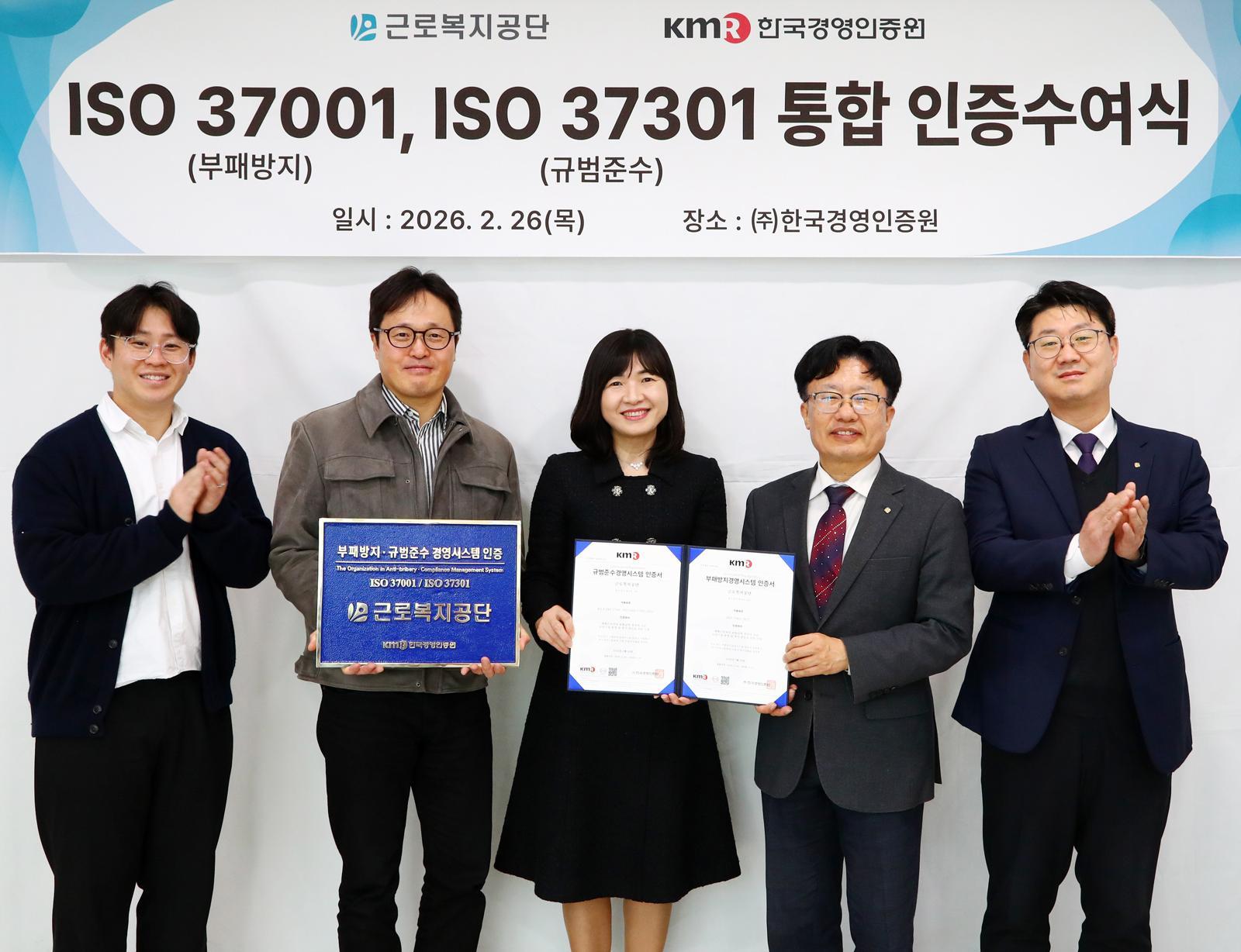 근로복지공단 사석중 안전윤리경영본부장(오른쪽에서 두 번째)이 26일 황은주 한국경영인증원 대표이사로부터 ISO 37001, 37301 통합 인증서를 받고 있다. 근로복지공단 제공