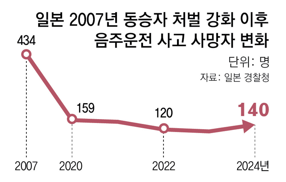 그 결과 음주운전 사망자는 2007년 434명에서 2024년 140명으로 크게 줄었다. 연구소 관계자는 “일본은 교통사고 책임 주체를 확대함으로써 음주운전으로 인한 피해 사례가 크게 줄었다”고 설명했다. 신이철 원광디지털대 경찰학과 교수는 “음주운전 방조에 대한 법 조항을 명문화해서 현장 경찰의 혐의 입증 부담을 덜어줘야 한다”고 조언했다.