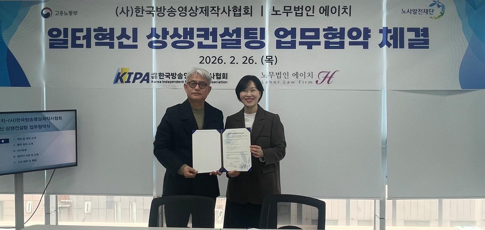 노무법인 에이치는 지난 26일 사단법인 한국방송영상제작사협회와 ‘일터혁신 상생컨설팅’ 사업의 추진과 확산을 위한 업무협약(MOU)을 체결했다고 27일 밝혔다.