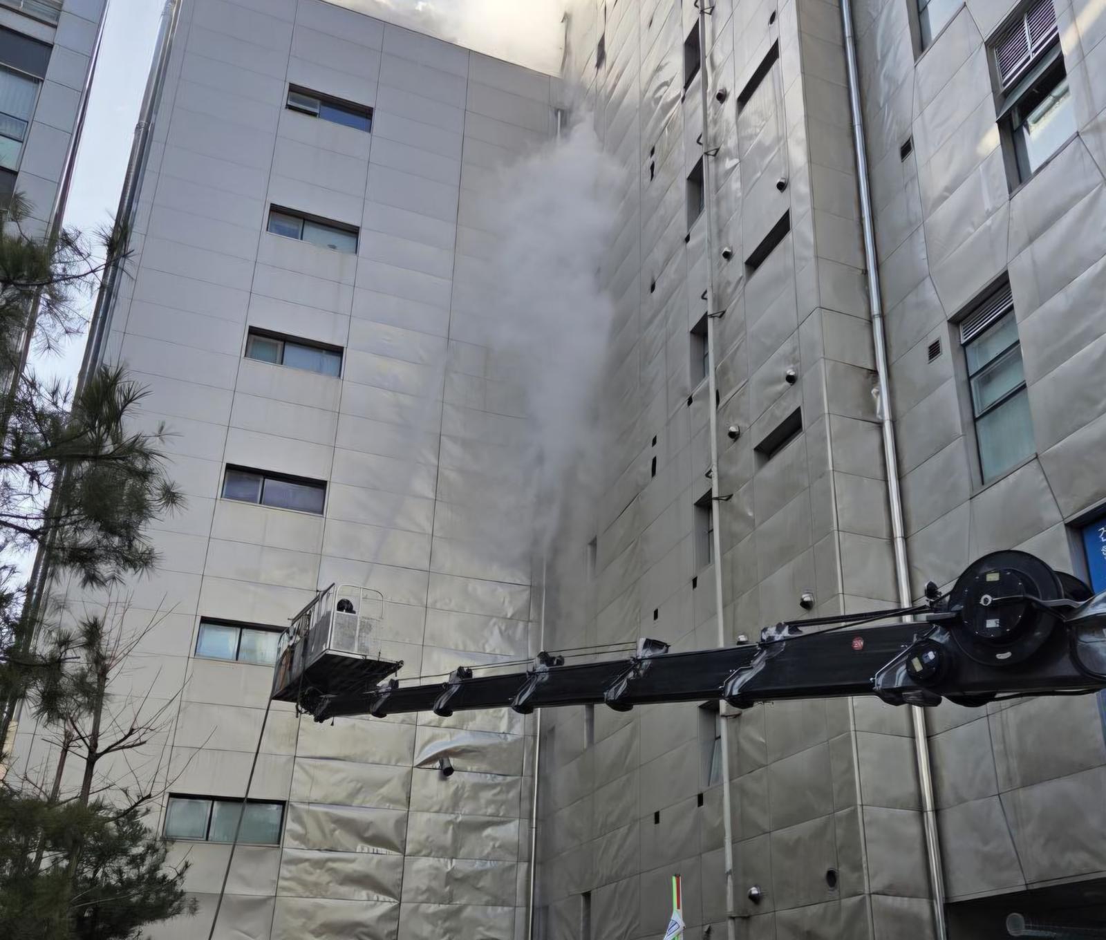 소방당국은 ‘외벽 패널 작업 중 불이 났다’는 관계자 신고를 접수하고 ‘대응 1단계’를 발령한 뒤 장비 40대와 인력 99명을 투입해 진화 작업을 벌이고 있다.