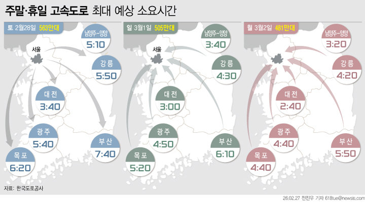 삼일절 연휴(2월28일~3월2일) 첫날이자 토요일인 28일은 고속도로 교통량이 연휴 기간 중 가장 많을 것으로 전망된다.