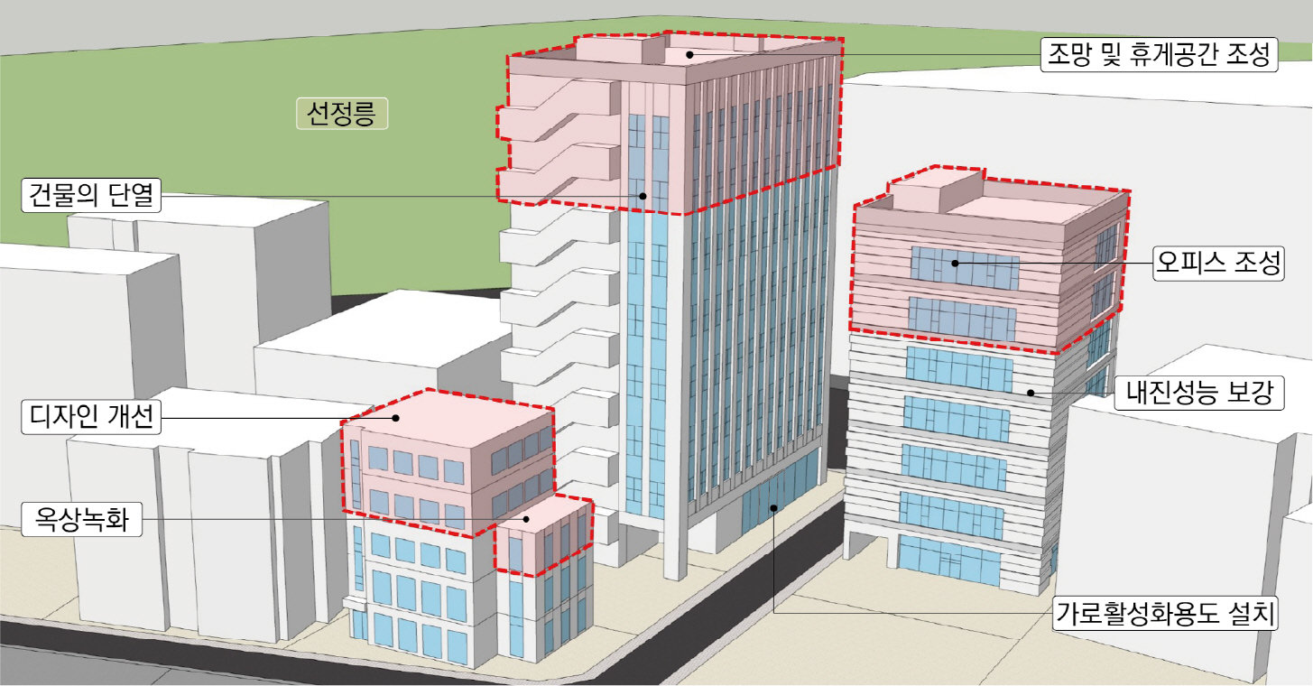 구는 사용승인 15년 이상 건축물을 대상으로 건축위원회 심의를 거쳐 용적률과 건폐율, 높이 등 건축 기준을 완화하고 연면적의 최대 30%까지 증축을 허용할 방침이다. 대신 내진 및 구조안전 보강과 단열, 에너지 성능 향상 등 건축물의 기본 성능을 개선하면 인센티브를 부여한다. 디자인 개선과 건물녹화도 평가 항목에 포함된다. 인센티브 항목에 화재·침수 대비와 사각지대를 줄이고 범죄 위험을 낮추는 범죄예방(CPTED) 설계까지 반영해 안전성과 공공성을 함께 높이도록 했다.