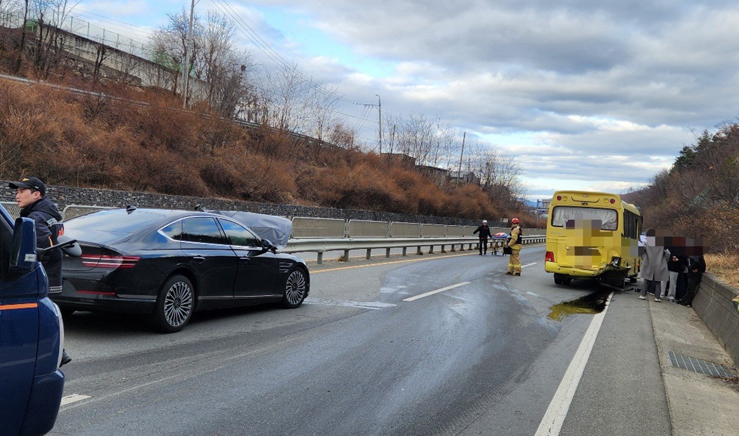 4일 경북소방본부 등에 따르면 전날 오후 4시 29분께 경북 성주군 용암면 문명리 67번 지방도(왕복 4차선)에서 승용차가 앞서가던 초등학교 통학버스를 추돌했다.