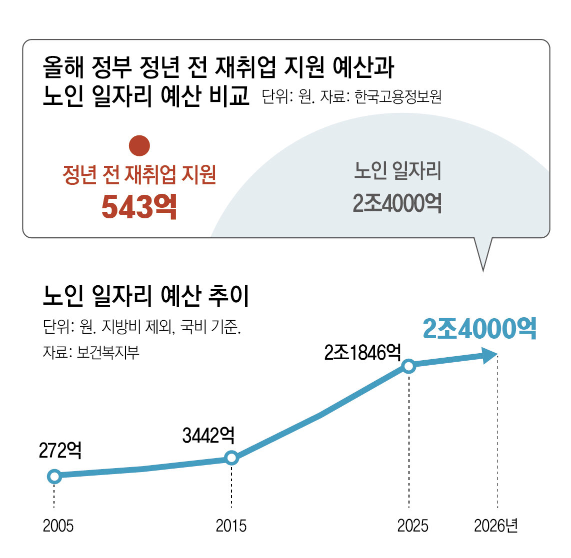 반면 65세 이상 고령층을 대상으로 한 노인 일자리 예산은 2005년 272억 원에서 2020년 1조2015억 원으로 처음 1조 원을 돌파한 데 이어 올해 2조4000억 원까지 늘었다. 21년 동안 100배가량 급증한 것이다. 지방비를 포함하면 올해 예산은 5조 원에 달한다. 정부가 급속한 고령화와 노인 빈곤 등에 대응하기 위해 용돈벌이 수준의 일자리를 대거 늘린 탓으로 풀이된다. 노인 일자리 대부분은 공공시설 봉사, 취약계층 지원 등 공익 활동형으로 월평균 29만 원을 받고 1년 미만 근무하는 질 낮은 일자리에 그친다.