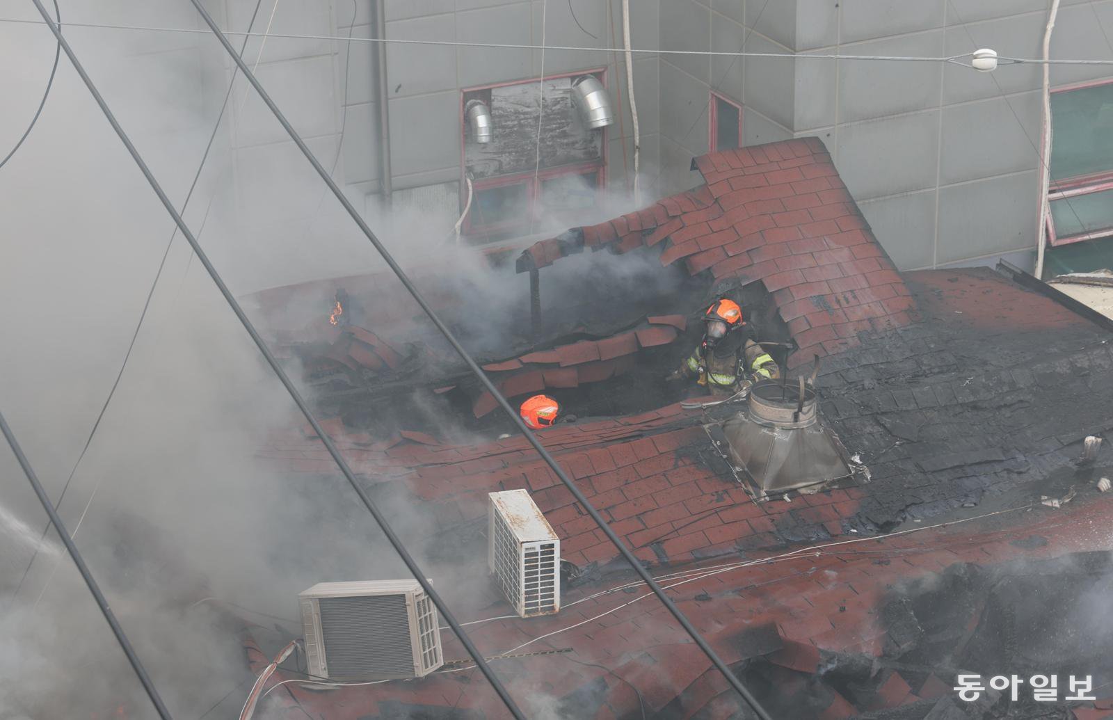 5일 오후 1시 21분경 서울 종로구 귀금속상가 2층에서 화재가 발생해 소방대원들이 진압하고 있다. 인명 피해는 없었지만 인근 도로가 전면 통제돼 교통 혼잡을 빚었다.