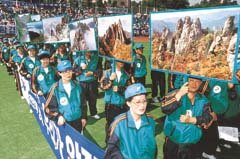 올 가을 단풍구경은 금강산에서 하세요. 20일 서울 효창운동장에서 열린 제16회 대통령기 이북도민체육대회에서 강원도선수단이 금강산 사진을 들고 입장하고 있다.