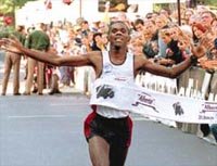 마라톤의 역사가 다시 쓰여지는 순간 세계는 열광했다. 20일 열린 베를린마라톤에서 브라질의 무명 마라토너인 호나우두 다 코스타가 베를린 시민의 뜨거운 박수를 받으며 결승 테이프를 끊고 있다.