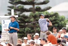 타이거 우즈(24·미국)가 갤러리들에게 둘러싸인 채 99메르세데스 챔피언십골프대회 1라운드 3번홀에서 드라이버 티샷을 날린뒤 타구를 주시하고 있다. 우즈는 4언더파 69타로 공동10위.<카팔루아Ap연합>