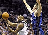 '나 막아봐라.' 밀워키 벅스의 샘 카셀(왼쪽)이 올랜도 매직 팻 개리티의 블록슛을 따돌리고 드라이브인슛을 터뜨리고 있다.〈밀워키AP연합〉