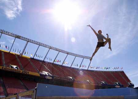 4일(한국시간) 캐나다 에드먼턴 커먼웰스스타디움에서 열리는 세계육상선수권대회 개막행사에 출연하는 한 참가자가 예행연습을 하고 있다.「AP」