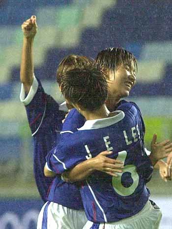 7일 오후 월드컵 수원경기장에서 열린 타이거폴스 토토컵 국제여자 축구대회 한국과 중국의 경기에서 1대1일 동점골을 터뜨린 한국 이지은(6번)이 동료와 함께 기뻐하고 있다.「연합」