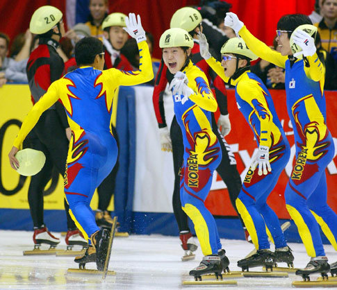 캐나다 몬트리올 모리스 리차드 경기장에서 벌어진 2002 쇼트트랙 스피드스케이팅 세계 선수권대회 남자 5000m계주에서 금메달을 따낸 김동성,이승재,안현수,안중현(왼쪽부터)이 환호하고 있다.