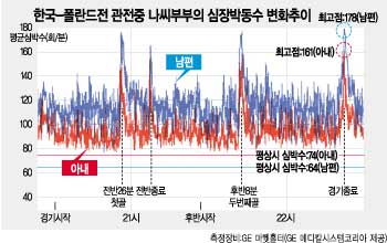 한국팀이 실점 위기를 맞거나 태극전사의 슛이 폴란드팀의 골문을 빗나가는 안타까운 순간에도 나씨 부부의 심박수는 100회를 넘었다. 휴식시간에 응원을 할 때도 나씨의 심박수는 170회까지 상승했다. 아내 정씨는 첫 골 때보다 높은 155회.