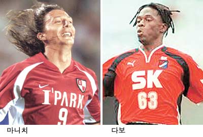 하지만 이동국이 득점왕에 오르기 위해서는 외국인 선수들의 거센 도전을 물리쳐야 한다. 최근 우성용과 찰떡 호흡을 과시하고 있는 부산 아이콘스의 마니치는 가장 강력한 라이벌. 마니치는 27일 홈에서 대전 시티즌을 맞아 우성용과 1골 1도움씩을 주고받으며 팀의 3-0 승리를 이끌었다. 마니치 역시 시즌 4호골째. 마니치의 강점은 우성용, 디디, 하리, 송종국 등 전방에서 도움을 줄 수 있는 뛰어난 동료 선수들이 많다는 것.