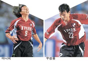 부산 아이콘스의 우성용과 유고 출신 마니치도 ‘국내 최고의 콤비’에 도전장을 내밀기에 부족함이 없다. 지난 시즌부터 제2의 전성기를 맞고 있는 우성용은 유고 용병 마니치에게 없어서는 안될 선수다. 27일 대전 시티즌과의 경기에서 우성용과 마니치는 골과 도움을 서로 주고받으며 2점을 뽑아내 ‘우애’를 과시했다.