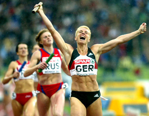 독일팀의 마지막 주자 그리트 브루어가 결승선을 가장 먼전 통과한 후 두손을 번쩍 치켜들며 우승의 기쁨을 만끽하고 있다. 독일팀은 12일 독일 뮌헨 올림픽스타디움에서 열린 유럽육상 챔피언십 여자 400m계주에서 우승을 차지했다.「AP」