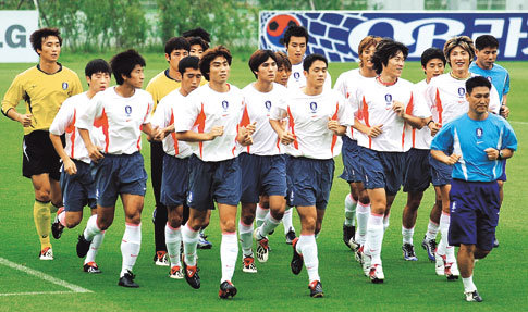 남북통일축구대회와 부산 아시아경기대회에 출전하는 축구 대표팀이 2일 파주 트레이닝센터에 집결해 가벼운 달리기로 첫 훈련을 시작했다. 오른쪽 맨 앞이 최진한 코치.