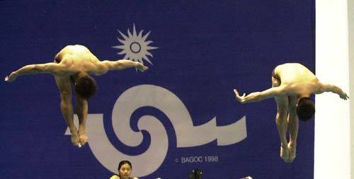 한국 다이빙 선수들이 27일 부산 구덕수영장에서 싱크로나이즈드 다이빙 연습을 하고 있다.