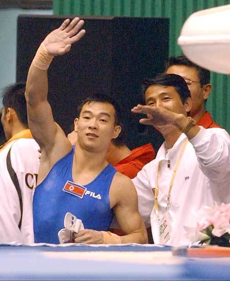 4일 부산 사직체육관에서 벌어진 아시안게임 남자 체조 안마 결선에서 북한 김현일이 공동우승을 확인한 뒤 손을 들어 답례하고 있다.「연합」
