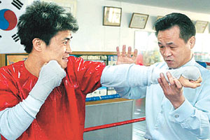 '이렇게 하는거야.' 재기전에 나선 최요삼 선수 (왼쪽)에게 전 세계 챔피언 장정구씨가 직접 자세지도를 하고 있다. 원대연기자