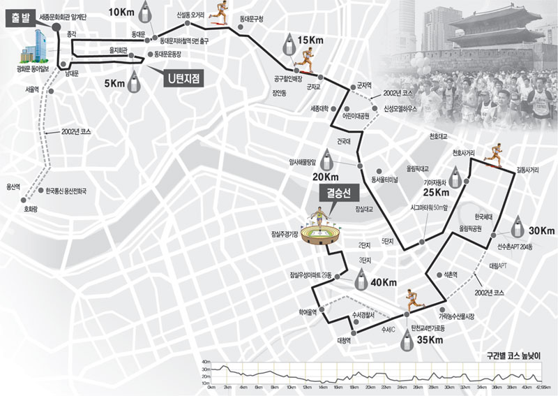 오는 3월16일 서울 광화문 세종문화회관 앞을 출발해 잠실주경기장에 이르는 42.195㎞의 풀코스에서 열리는 2003동아서울국제마라톤은 한국 마라톤 기록의 산실답게 또 다시 코스를 정비하는 등 대대적인 변신을 꾀한다. 동아마라톤 사무국은 지난해 12월 기존 구간중 약간의 오르막과 내리막이 있었던 남대문∼용산역∼남대문 코스와 지하철3호선 학여울역 못미친 부근의 굴다리 구간을 없애는 등 코스를 새로 정비했다.