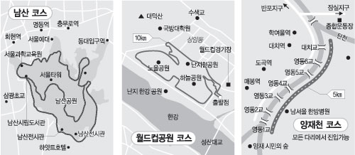 16일 열리는 2003동아서울국제마라톤을 앞두고 서울이 마라톤동호인들의 달리기 열기로 달아오르고 있다. 이들 동호인들이 즐겨 찾는 곳은 한강둔치, 남산, 상암동 월드컵 공원 등 주위 경관이 수려하고 비교적 코스 정비가 잘 된 곳.